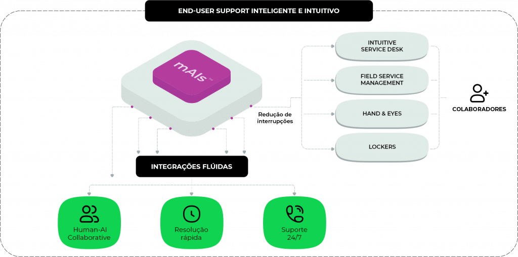 Nosso suporte ao usuário é viabilizado pela mAIs™, Modular AI Suite, o framework de IA da Positivo S+ para Digital Workplace.