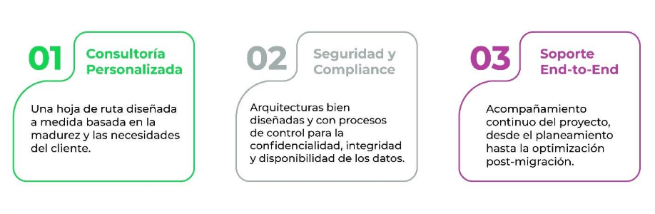 Una migración debe ser diseñada no solo para mover los datos, sino para establecer una arquitectura segura y optimizada desde el principio. Una estrategia sólida (basada en las 7 Rs de la migración)* garantiza que su infraestructura sea flexible, escalable bajo demanda y compliance con las mejores prácticas.